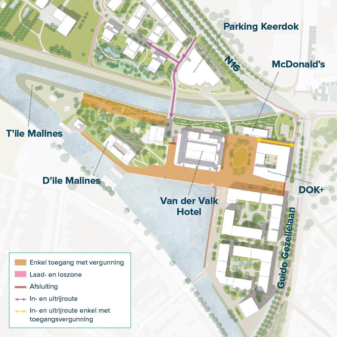 - Kleine leveringen gebeuren via de laad- en loszone achter het Van der Valk hotel, bereikbaar via parking Keerdok. Hiervoor is geen vergunning nodig.