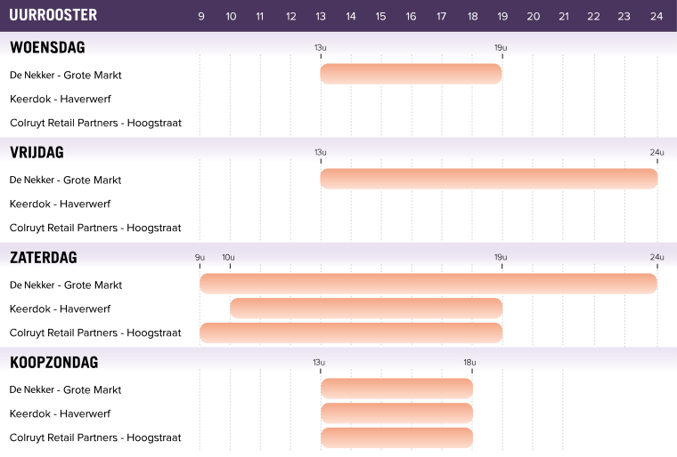- Vertrektijden Shopping Shuttle halte Keerdok: 13u, 13.40u, 14.20u, 15u, 15.40u, 16.20u, 17u, 17.40u