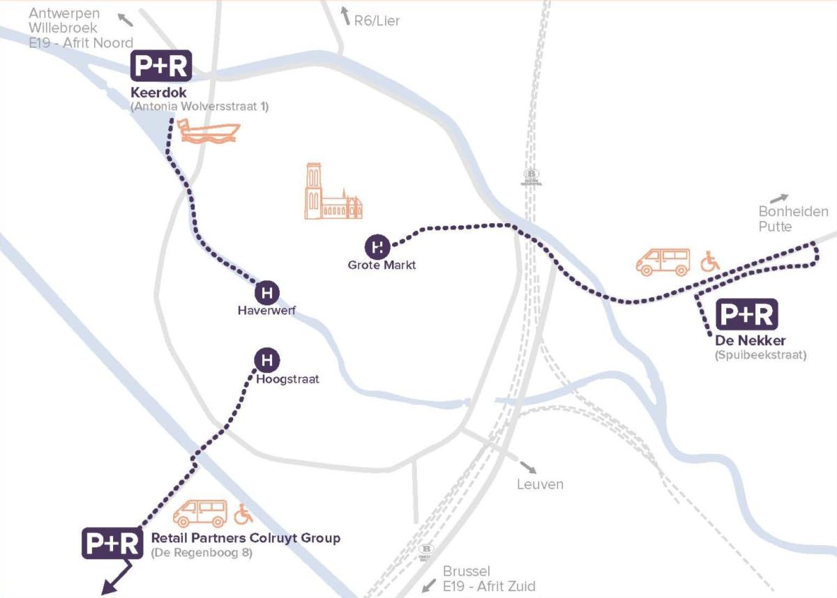 Parkeren doe je op de gratis parking De Nekker. De ingang vind je aan de zijde van UGC Cinema's. De halte is daar ook. Wacht op het eerstvolgende busje. De wachttijd bedraagt op zaterdag maximaal vijf minuten. Op woensdag, vrijdag of koopzondag wacht je maximaal 10 minuten. Stap uit op de Grote Markt en geniet van Mechelen! Genoeg gewinkeld en genoten? Neem aan de halteplaats op de Grote Markt een shuttlebusje terug naar parking De Nekker.