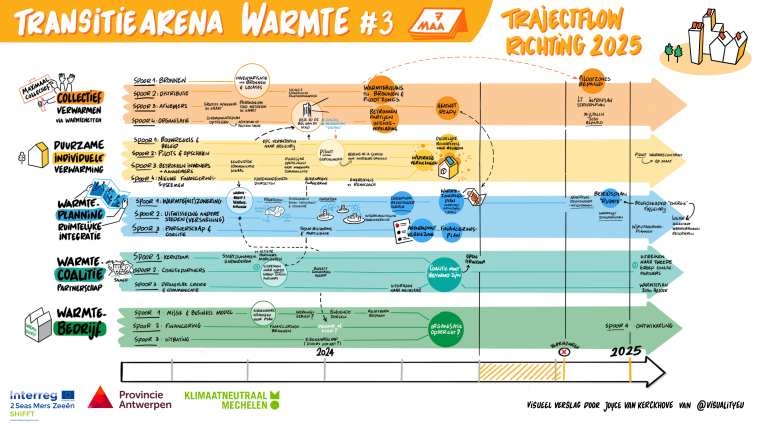 Tijdens de tweede workshop van de transitie-arena werkten we voor diverse transitiepaden inspirerende toekomstbeelden uit op de lange (2050) en middellange (2030) termijn. Vanuit deze toekomstbeelden formuleerden we concrete ambities voor de komende twee jaar. Zo kregen we een eerste zicht op mogelijke interventies waarmee we echt het verschil kunnen maken voor de warmtetransitie op Mechels grondgebied.
