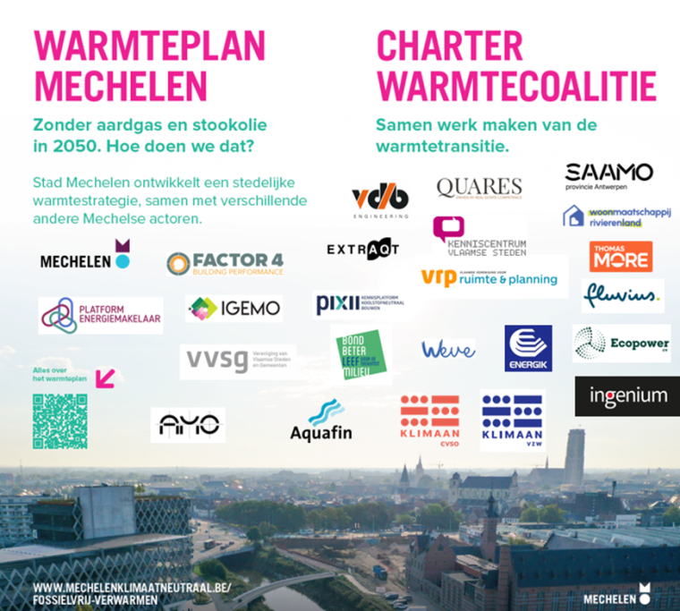 Tegen 2050 wil Stad Mechelen alle gebouwen in de stad verwarmen en koelen zonder gas of stookolie. Om dat doel te bereiken, is samenwerking met verschillende actoren nodig. Daarom werd in 2024 een lokale warmtecoalitie opgericht.