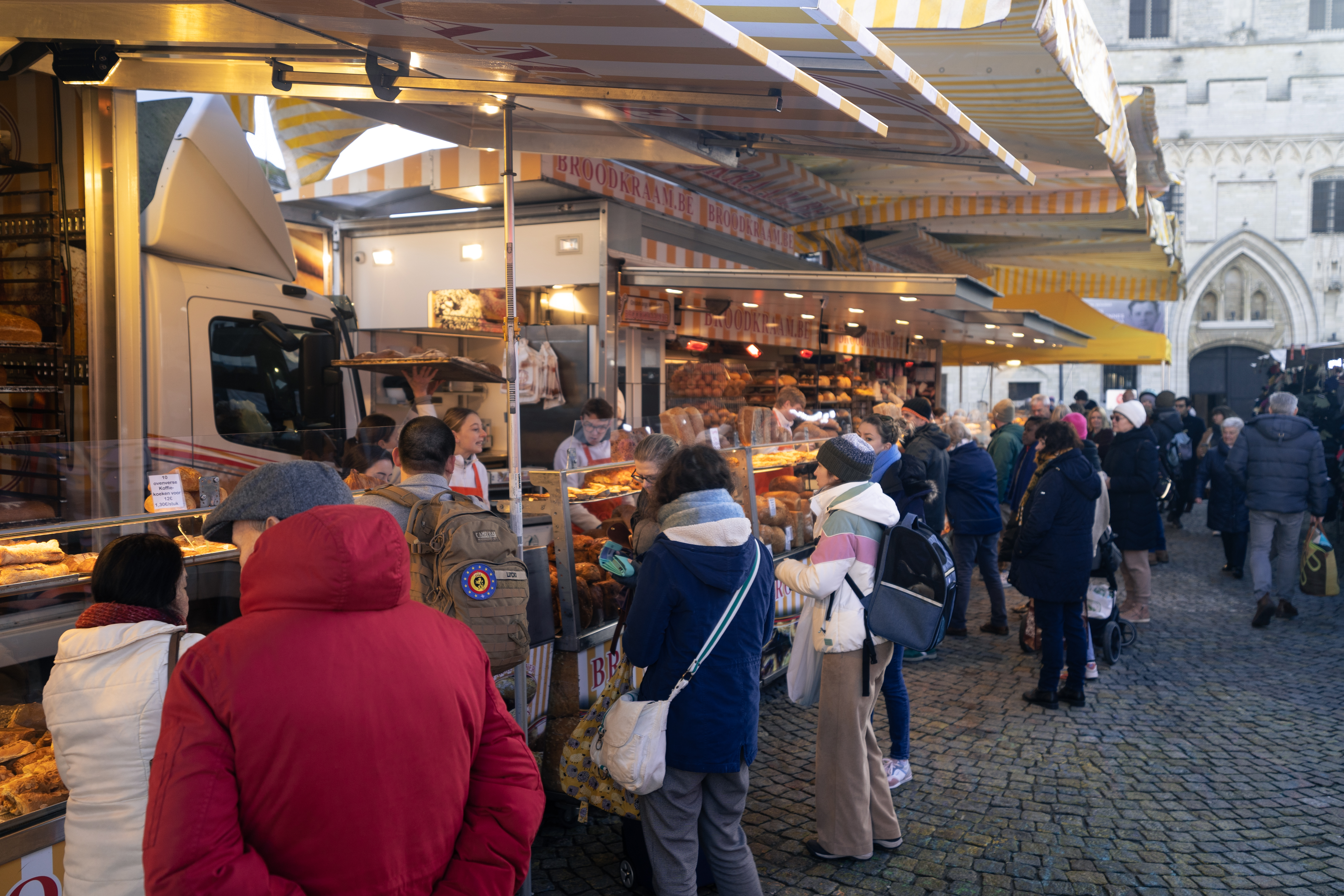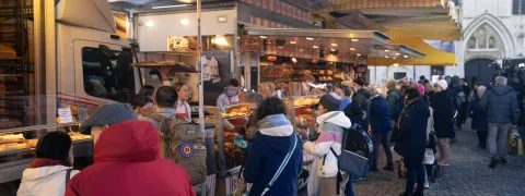 Waar staat de markt op 20 en 27 december? Op de IJzerenleen, D. Boucherystraat, Hallestraat, Botermarkt, voor het stadhuis, Befferstraat en Veemarkt. De markt is open van 7 tot 13 uur, zoals gewoonlijk. Wandel dus zeker tot aan de Veemarkt om jouw vaste kraam terug te vinden.
